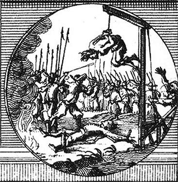 Флибустьеры пытают пленных испанцев. Гравюра из книги А. О. Эксквемелина «Пираты Америки» (1678)