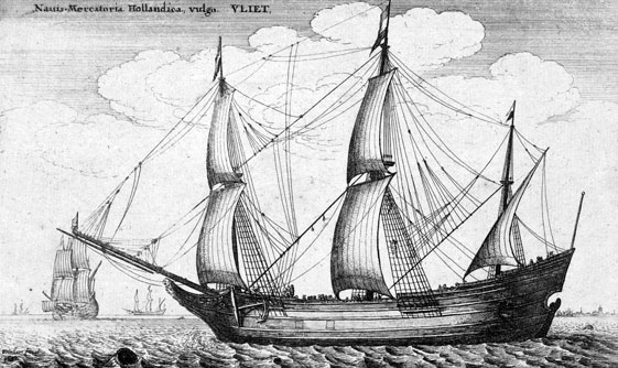 в свое первое плавание, чтобы отыскать съестные припасы.Флейт – трехмачтовый корабль голландской постройки. Гравюра XVII века