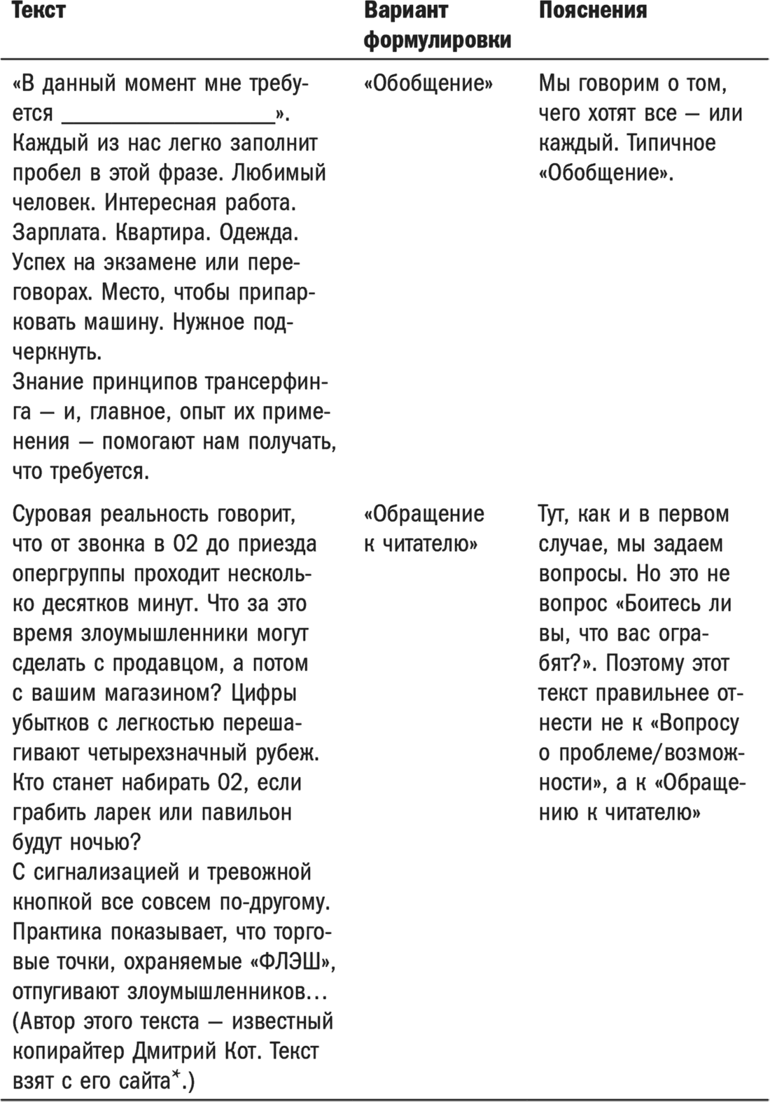 После «Вопроса» «Обобщение» в некотором смысле шаг назад. Если в «Вопросе» мы трясли адресата за лацканы, спрашивая: «Ты же не хочешь проблем, правда? Ты же хочешь счастья, верно?» – то в «Обобщении» отчасти идем на попятный. Мы снижаем градус, говоря: «Никто из нас не хочет… Все мы хотим… Каждому приятно…» Для чего же нам требуется «Обобщение»? Зачем отступать, если можно, как в «Вопросе», взять быка за рога? Отступление может понадобиться для разговора о щепетильных, стыдных проблемах, где тыкание пальцем не лучшая тактика. Впрочем, про такие проблемы мы с вами поговорим чуть позже. А пока – еще несколько примеров.