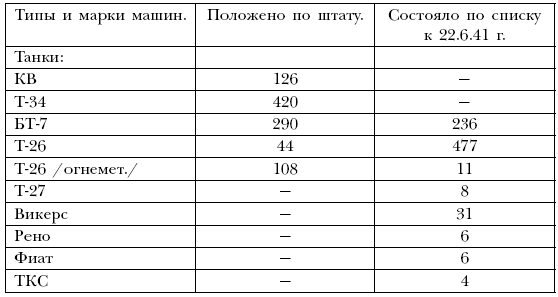 1. Формирование корпуса началось в марте 1941 года, и к началу Великой Отечественной войны не был укомплектован положенной материальной частью. По штату было положено танков КВ – 126 и Т-34 – 420. В корпусе же не было ни одного танка Т-34 и КВ.