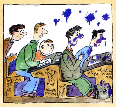 А то и старика со старухой и с золотой рыбкой — полугодовая работа какого-нибудь Димы Аксенова с мамой и с бабушкой — раз и тикать. И из этого шедевра лепим полосатую бомбу. В нее наливаем чернила. И на уроке, допустим русского языка, тихонечко так между рядами пускаем. Кто-то с передней парты ее хвать. И счастлив ненадолго. (Не знаю как у Вас, Татьяна, а у нас впереди отличники сидели и передовики дисциплинарные. А нормальные люди сзади. И какая-то не очень активная борьба между ними велась.)