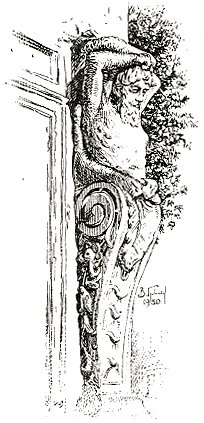 Но вот вагоновожатый поворачивает рукоятку, переключая передачи электродвигателя: трамваю теперь ехать вверх — в наши края, в гору. Уже не мелькают, а медленно проплывают дома и домишки Кантарной, и теперь я могу подробно рассмотреть лепные украшения уже так хорошо знакомых мне зданий — выпуклые, очень красивые загогулины, ветки и листья диковинных растений, сказочные физиономии. Два огромных каменных бородача-атланта, напрягши мышцы, держат — и как они только не устают! — балкон на углу здания (на этом моем рисунке 1980 года — один из них, но атланты уже ничего не держат, балкон почему-то снесли); на том же доме — львиные головы, причем у каждого льва в зубах — кольцо, а на кольцах тех висят тяжеленные гирлянды каменных же фруктов.
