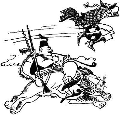 И вот впереди показалось что-то чёрное и гигантское. Тартарен стреляет и слышит ужасный рёв. «Ага!» — кричит охотник, хватаясь за нож. Но напрасно он схватился за нож; у ног его лежит не грозный царь пустыни, а безобидный домашний ослик! Прибежала хозяйка ослика и избила Тартарена палкой. Так печально закончилась его первая охота на львов.