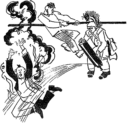 На сцену вразвалку вышел толстый дядя в белых шароварах, в короткой куртке и с широченным красным поясом. На каждом плече у него было по тяжёлому ружью, за поясом торчал огромный охотничий нож, на животе — патронташ, на боку — револьвер.
