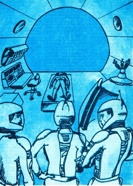 Тем временем Тим тщетно пытался открыть ведущую из этого помещения дверь — она никак не поддавалась. Людвиг отодвинул его в сторону, наклонился и нажал на скрытый рычаг. Дверь открылась, и они вошли в обсерваторию корабля. На койке, лицом к прозрачному куполу, лежало тело космонавта.