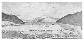 Со свежим восточным ветром скоро достигли мы восточного предместья Капитанской гавани, где, заштилев под высоким берегом, взяты были на буксир двумя 16-весельными байдарами, высланными из селения Иллюлюк, прибуксировавшими шлюп к острову Амахнаку, где шквал от S заставил нас положить якорь. Селение Иллюлюк приветствовало нас 7 пушечными выстрелами, а вскоре явился и его правитель, Петровский, по русскому обычаю с хлебом-солью от своей супруги и с приглашением посетить их дом.