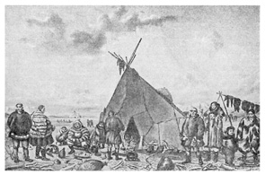 Вокруг юрт, на сушилах, из дерева или китовых костей составленных, развешано нерпичье мясо, разрезанное на куски, черное и отвратительное. Когда уезжают на короткое время, то разбирают юрту, все пожитки складывают на сушила, покрывают лахтаками и крепко увязывают, и все это поручают надзору остающихся.