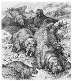 Моржи очень скоро остреливаются; это свойство их много способствует промышленникам в их делах. Льды эти усеяны также были множеством черных чаек, называемых здесь разбойниками (Larus parasiticus).