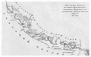 Поутру находились мы против того места, где 27 августа прошедшего года едва не потерпели кораблекрушения. Мыс этот промышленниками называется Гусиным. Низменный, отрубистый к морю, крайне единообразный берег, простирающийся отсюда к Костину Шару, именуется Гусиным берегом, или Гусиной землей, а южная оконечность его, составляющая северное плечо Костина Шара, Гусиным же Носом. Для отличия двух Гусиных мысов нанесены на нашей карте первый под названием Северного, а последний Южного Гусиного Носа. Большой залив, между мысами Северным Гусиным и Бритвиным заключенный, не имевший доселе особого имени, назвал я заливом Моллера, в честь начальника морского штаба.