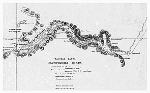 К составленной нами карте Маточкина Шара должен я присовокупить только несколько слов. Идя в этот пролив от запада, следует остерегаться каменного рифа, окружающего северный берег даже за мыс Бараний и простирающегося почти до середины устья, и для этого держаться ближе к мысу Столбовому, который служит весьма хорошей приметой этому месту. От мыса Столбового открываются две низкие черные лудки, лежащие к S от Бараньего мыса и составляющие часть упомянутого каменного рифа. Будет также виден островок серого цвета и, следовательно, весьма несправедливо называемый Черным, который, сливаясь с берегом от W, с трудом может быть отличен. От Маточкина мыса, до которого следует держаться южного берега, должно лечь несколько правее южнейшей из двух лудок, так чтобы пройти между ней и Черным островком; это есть ближайший путь, но можно идти также и между островком и материковым берегом, где пролив шириной около одной мили и глубиной от 5 до 7 сажен. Миновав островок и лудки, вправо на NO, держась посередине между обоими берегами и, когда Бараний мыс створится со Столбовым, клади якорь. Глубина будет 12, 11 и 10 сажен, грунт сначала ил, а потом ил с маленькими камешками; лежать в этом месте на якоре весьма спокойно и безопасно. Не следует только удаляться от середины, поскольку к обоим берегам глубина весьма скоро уменьшается, но эта самая покатость берега обращается в пользу; ибо при ветрах, дующих прямо на берег, нет почти возможности, чтобы якорь подрейфовало. Можно здесь также весьма удобно налиться чистой прекрасной водой из ручьев, стекающих во многих местах с гор; если же понадобятся дрова, то нужно посылать далее по проливу, где, как сказано выше, плавнику найти можно в изобилии.