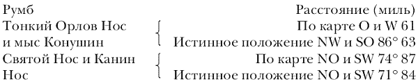 Это расстояние выведено мной из его пеленгов и счислений. Домогацкий почитал себя около трех миль далее. Широта, определенная им по меридиональной высоте солнца, отличается только на 40 от той, какая выходит по означенному пеленгу.