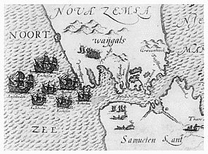 Поставив на пригорке крест с надписью в знак своего пребывания, голландцы оставили остров Токсар 16 июля и поплыли далее. Погода была так тепла, как в Голландии в каникулы, и комары беспокоили их чрезвычайно. Следуя вдоль берега, низменного и песчаного, простиравшегося к О и OtN, миновали они речку Колоколкову (Colocolcova), узкую и извилистую. Русские рыбаки, плывшие с ладьей, взялись показать им дорогу, и 17 июля вошли вместе с ними в речку Песчанку (Pitzano), которая оказалась также мелкой и неудобной. Тут узнали голландцы, что до реки Печоры, на расстоянии 11 миль, встретят они много мелей, но, миновав их, найдут большую глубину, а у острова Варандея, который на картах называется Олгейм (Olgijm), хорошую гавань, 18 числа вошли они в Печору и бросили на 6 саженях глубины якорь, чтобы переждать сильную бурю от О; на рассвете поднялся северный ветер, и они продолжали путь свой к востоку, а 21 числа, по счислению в 30 милях от Печоры, увидели берег острова Вайгач; море было покрыто множеством плавающего леса, между которым видны были целые деревья. Морская вода была так мутна, как в канаве (als dat van de Slooten in Hollant). Приблизясь к берегу, простиравшемуся между N и NNW, усмотрели они у самой воды два креста, которые, как после оказалось, были русские. В этом месте останавливались они на короткое время на якоре на 10 саженях глубины и нашли широту 69°45'. 22 числа пришли к другому мысу, в 5 милях к SO от первого, против которого лежали четыре или пять островков, на одном из которых стояли два креста. Тремя милями далее открылся им пролив около мили шириной, посреди которого лежал остров. Линшотен утверждал, что это тот самый пролив, который отделяет Вайгач от твердой земли; но адмирал Най, хотя и не мог прямо ему противоречить, приказал исследовать берег еще далее к югу, чтобы более в том увериться. Проплыв в ту сторону 10 или 11 миль, до широты 69°13', и найдя, что берег уклоняется к западу и глубина становится менее, возвратились они к прежде найденному проливу. В этот день (23 числа) солнце в первый раз закатилось на NNO, но вскоре потом опять взошло на NOtN. Войдя в пролив, нашли они глубину от 10 до 5 сажен, почему стали на якорь и послали вперед гребные суда для промера, которые возвратились с радостной вестью, что далее к востоку глубина более, вода синее и солонее, и следовательно, нет сомнения, что в той стороне найдут они открытое море. В надежде этой утверждало их также и сильное течение с востока, приносившее с собой множество льда, который подвергал суда их немалой опасности. Убедившись, что находятся в проливе, дали они ему название Нассавского (De Straet van Nafsouw), в честь принца Мавриция Оранского Южный берег пролива назвали Новой Вестфризландией, а остров Вайгач – Енкгейзенским островом. На берегу последнего нашли они до 400 деревянных болванов весьма грубой работы, которые должны были изображать мужчин и женщин. Полагая, что местные жители изображениям этим поклоняются, назвали они то место мысом Идолов (Afgodenhoeck). Широту определили здесь 69°43'. Другому мысу, лежащему от него в двух милях к востоку, дали они название Крестового, потому что на нем найден большой крест; еще один мыс, лежащий в трех милях от Крестового, назвали Спорным (Twisthoeck) по причине спора, происшедшего между ними о том, кончается ли тут пролив или нет. Оконечность материкового берега, лежащую против этого мыса, на которой была поставле