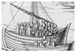 2 июля снялись Наевы суда с якоря и направили путь к востоку. [58] 5-го встретили весьма много льда и несколько раз принимали скопившийся туман за берег; широта по наблюдению 71°20'. Солнце находилось на SSW, прежде нежели достигало наибольшей своей высоты. 7 числа увидели они канинский берег. В следующие два дня встречали опять множество льда, который выплывал из губы, лежащей между Каниным и Святым Носом (Чешская губа), и спирался у острова Колгуева, а особенно на мелях, от южной его оконечности к OtS простирающихся (Плоские Кошки), где он большими грудами был нагроможден. 9 числа подошли они к берегу Святого Носа и, продолжая путь к NO, остановились 10-го на якоре за островом Токсаром (‘t Eylant Toxar). В этом месте встретились они с одной русской ладьей, шедшей в Печору, к которой на другой день присоединились еще три. Мореходы, бывшие на этих ладьях, уверяли голландцев, что у Вайгача встретят они непреодолимые препятствия: одни говорили, что пролив мелок и всегда почти покрыт льдом, что он усеян множеством камней, делающих проход невозможным; другие утверждали, что хотя пройти этим проливом и можно, но что множество в нем китов и моржей часто окружают и разбивают корабли; что недавно еще, по повелению царя, посланы были туда три ладьи, которые, не сделав ничего, погибли во льду со всеми почти людьми, кроме весьма немногих, которым удалось спастись на берег с этим печальным известием. Голландцы не верили этим рассказам, считая их выдуманными для того только, чтоб отклонить их от предприятия.