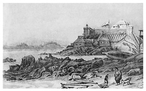 Селение состоит теперь из двух частей: крепости и предместья. В первой заключается двухэтажный дом главного правителя, стоящий на самой вершине кекура, около 80 футов над водой, образующий с окружающими его башнями и батареей, вооруженными 32 орудиями, как бы цитадель места; остальное обнесено только палисадом без пушек. Тут расположены казармы для служителей, алеутские кажимы, [322] дома для чиновников, больница, бани, магазины, лавки и адмиралтейство с мастерскими. Сюда же примыкает длинный, на сваях, мол, служащий для приставания и выгрузки судов. Вне крепости к востоку находится церковь и до 25 домов, большей частью принадлежащих частным людям, состоящим в службе компании, и огороды.