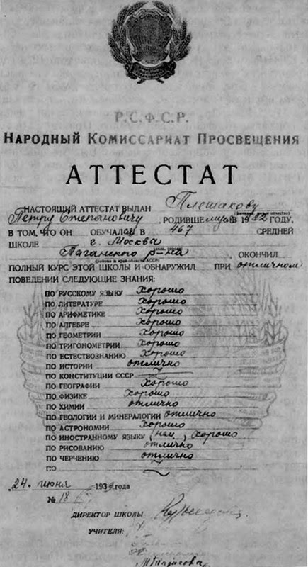 серьезную и для многих людей того времени таинственную специальность, но и сделал важный, не всем доступный шаг — вступил в партию. Перед нами «партийная характеристика на лейтенанта Плешакова Петра Степановича, кандидата в члены ВКП(б) с апреля 1943 г., к/к (кандидатская карточка) № 4971989 рождения июля м-ца 1922 года». Характеристика эта интересна не по своей сути, а как документ времени, за предельно сжатым, в пять десятков используемых слов, языком которой можно было найти и представление к награде, и приговор:«Товарищ Плешаков делу партии Ленина-Сталина предан. Морально устойчив. Политически развит хорошо. Правильно понимает и активно проводит в жизнь все мероприятия партии и правительства. К порученной партийной работе относится хорошо, выполняя ее быстро и аккуратно с необходимой партийной принципиальностью.