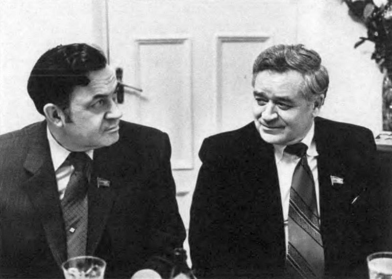 СССР Э. А. Шеварднадзе и академиком В. С. СеменихинымНа отдыхе в Пицунде летом 1985 года. Слева направо: П. С. Плешаков, В. И. Севастьянов, Т. Г. Анодина