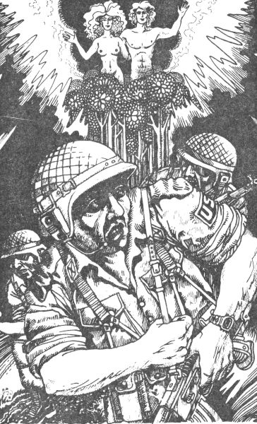 Яркое солнце, совершенно несуразное для этого времени года в штате Иллинойс, обеспечивало прекрасное освещение для телескопических камер. Морские пехотинцы, увешанные всевозможным оружием, пятились, спотыкаясь, гонимые ордой совершенно голых мужчин и женщин. Нудисты, смеясь и совершая нелепые прыжки, целились в них из игрушечных кольтов и бластеров, поливая лица вояк тонкими струйками воды. Автоматы, огнеметы, гранатометы, безоткатные орудия категорически отказывались стрелять, и толку от них было не больше, чем от первобытных дубинок. Еще немного, и закаленные ветераны побросали бесполезное оружие и пустились наутек, а некоторые так и остались стоять с глупым видом, облизывая забрызганные губы. Голые победители брали побежденных за руки и уводили в тыл своего неорганизованного строя.