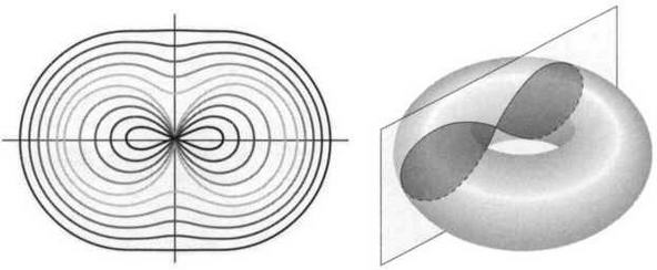 Слева — семейство гиппопед для случая 2 > R/r > 0,2. Справа — получение гиппопеды сечением тора плоскостью.
