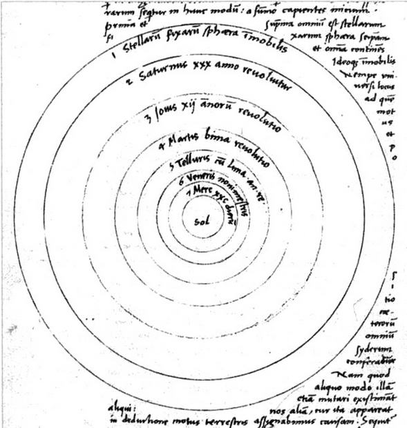 Страница 18 оригинальной рукописи «О вращении небесных сфер», хранящаяся в Ягеллонском университете в Кракове. Можно заметить, что Солнце находится в центре системы, а Земля — на третьей орбите, за Меркурием и Венерой.