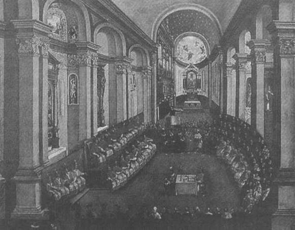 Сессия Тридентского собора в церкви Санта-Мария-Маджоре в Тренте. Во время сессий этого собора были выработаны руководящие линии Контрреформации.