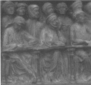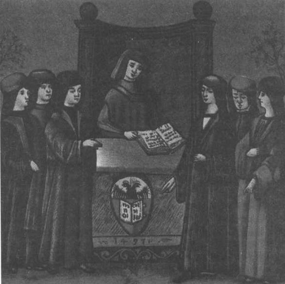 Студенты на фрагменте гробницы знаменитого итальянского юриста Джованни да Леньяно, который был utriusque luris doctor (доктором обоих видов права: гражданского и канонического) Болонского университета. Коперник изучал право в этом университете, чтобы придать образованию более практический характер.