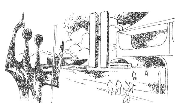 Я вспоминаю сюрреалистическую картину площади Трех Властей при лунном свете, когда полусферы конгресса становятся похожими на только что приземлившиеся корабли — посланцы других миров, а стоящий тут же, поблизости, черный скульптурный дуэт воинов — «геррейрос» с пиками в руках видится первым патрулем инопланетян, ступившим на Землю. В памяти оживают невесомые, слегка прикоснувшиеся к земле хрупкими углами колонны дворца Альворада; буйное пламя фламбоянтов, бросающих розовые тени на серые стены зданий; зеленое одеяло газонов на красной, словно пропитанной кровью земле. Я вспоминаю все это и чувствую, что бессилен передать восторг, который охватывает человека, оказавшегося в этом фантастическом городе, где экспрессия графики Пикассо помножена на ослепительно яркую палитру Матисса и погружена в тропическую атмосферу Гогена.