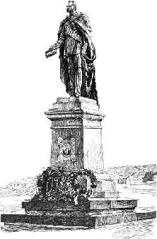 Следовавший за прибытием парохода в Петрозаводск день, 14 июня, был таким же безоблачным и жарким, как все предшествовавшие. Памятник Петра Великого работы Шредера, стоящий перед губернаторским домом, ярко горел с утра своей бронзой. Он заложен 30 мая 1872 г., а открыть в 1873 г. Петр изображен во весь рост; в одной руке у него свиток, другая простерта. Постамент сделан из чрезвычайно крепкого матюковского камня. Памятник недурен; облик императора гораздо внушительнее того, который поставлен в Петергофе у Монплезира. Неудивительно, что горожане то и дело зовут приезжающих сюда туристов полюбоваться им: посмотрите, да посмотрите! Тем же Шредером сооружен здесь памятник императору Александру II, воздвигнутый местным земством. Монарх изображен стоящим в порфире; высота статуи пять аршин.