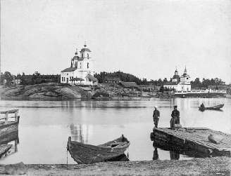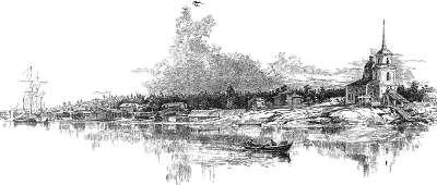 К восьми часам вечера пароход подошел к Петрозаводску. Город, с его прямыми улицами, разбитый на квадраты, разместившийся по отлогой покатости, представляется со стороны озера красивым. Высоко над всем прочим поднимается своими луковичными куполами новый собор, а подле него обозначается маленьким шпилем старейшая церковь города во имя Петра и Павла, построенная великим Преобразователем России, в 1693 году.