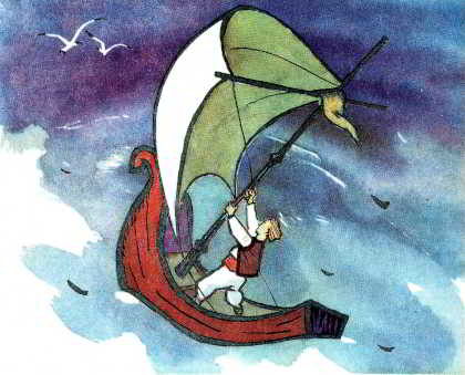 Разбушевались бури. Рыбаки перестали выходить в море. А Слава по-прежнему каждое утро поднимал парус, и маленькая шаланда его скрывалась в волнах. Вечером Синь ожидала Славу на берегу.