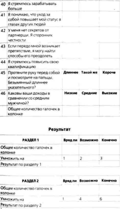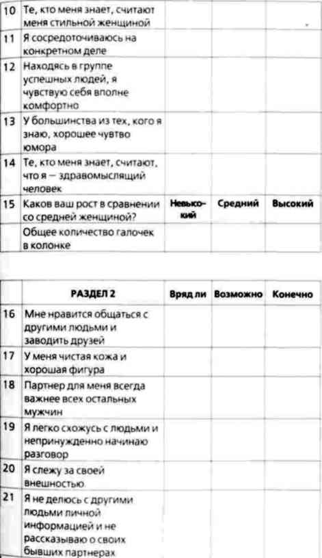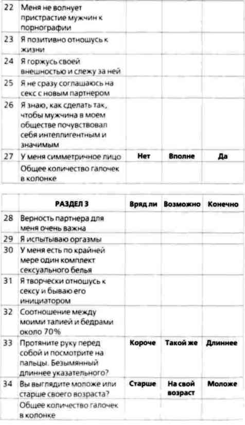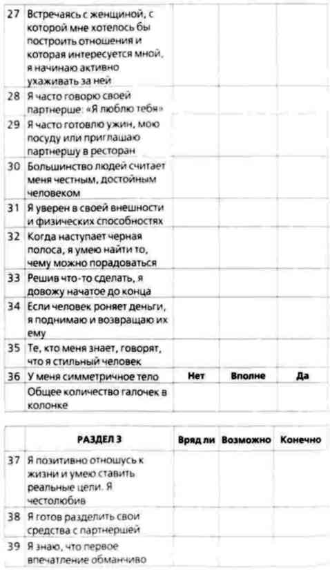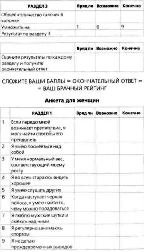 Эта анкета поможет вам оценить свой брачный рейтинг — то есть то, как оценивают вас представители противоположного пола по шкале желательности. Анкета будет полезна любому, кто хочет повысить свой брачный рейтинг и перейти на более высокий уровень. Она поможет вам определить свои слабости и поставить для себя новые цели. В какую бы категорию вы ни попали, если вам в ней комфортно, то все в порядке. Если же вы несчастливы, то этот тест подскажет вам, что нуждается в улучшении. Мы выяснили, что люди обычно бывают слишком суровы к себе, поэтому предлагаем вам попросить кого-нибудь, кто хорошо вас знает, заполнить эту анкету вместе с вами. Такой человек поможет сделать ваши ответы более объективными и точными. Кроме того, вы получите возможность не только оценить себя, но и узнать, как вас воспринимают другие люди. Многих удивляют оценки других людей в сравнении с собственными.