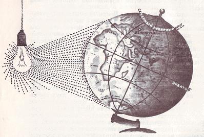 Смену дня и ночи можно устроить и на нашем глобусе. Поставьте его против лампы и заставьте вертеться вокруг своей оси (не воображаемой, а самой настоящей железной палочки!), и вы увидите, как одна сторона освещается, а другая остается в тени, потом она постепенно выходит из тени, на ней светло, а на противоположной — стало темно.