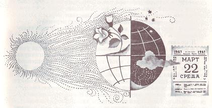 Но земной шар летит в космическом пространстве, совершает свой извечный путь вокруг Солнца. И постепенно меняется погода. Вот отбушевали февральские метели, наступил март месяц, первый месяц весны, очень еще холодный, но светлый. Дни все прибывают и прибывают, и вот уже по жаловало 22 марта — день весеннего равноденствия, когда на всем земном шаре день равен ночи, астрономическое начало весны в нашем полушарии.