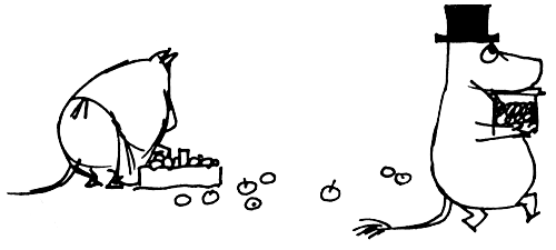 Муми-тролль вертел ручку, мама клала яблоки в соковыжималку, а папа носил банки с пюре на веранду. Малышка Мю сидела на верхушке дерева и распевала Великую яблочную песню.