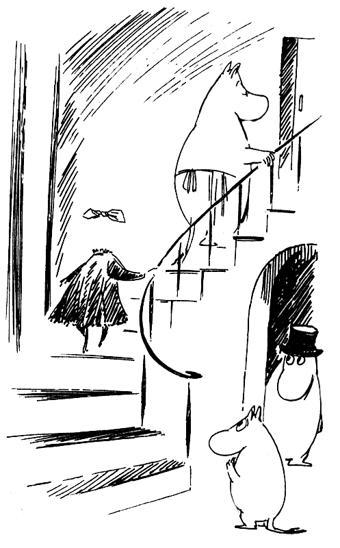 Колокольчик, звеня, спускался вниз по лестнице: один шажок в минуту и маленький перерыв перед следующим. Муми-тролль все утра ждал этих шажков. Но самым интересным сегодня был вовсе не серебряный колокольчик. Самое интересное были лапки. Лапки Нинни, которые шагали вниз по лестнице, очень маленькие лапки с боязливыми крошечными пальчиками, тесно прижавшимися друг к другу. Видны были одни только лапки, и это было ужасно.