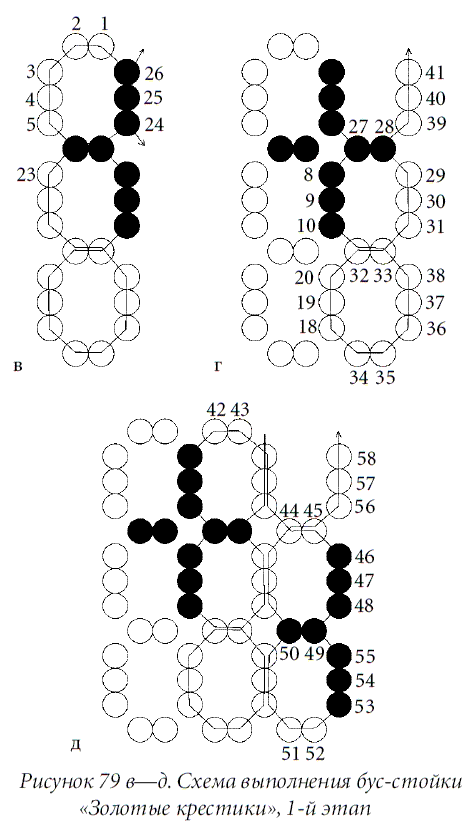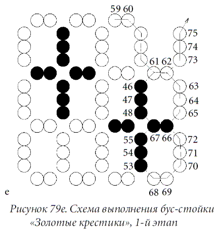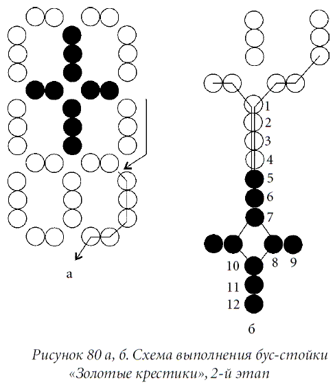 Выполнить подплетение. Для чего закрепить леску и вывести иглу через 2 нижние бисеринки первого овала (рис. 80 а). Набрать 4 бисеринки белого цвета (1-ю — 4-ю), 5 бисеринок золотистого цвета (5-ю — 9-ю), войти в 8-ю бисеринку в обратном направлении. Набрать 3 бисеринки золотистого цвета (10-ю — 12-ю), войти в 11-ю и 10-ю бисеринки в обратном направлении.