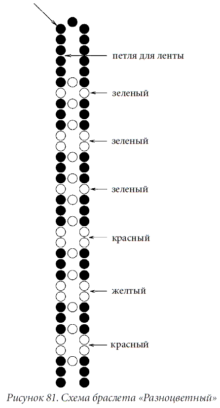 Обозначить бисеринки на схеме (рис. 81) нужными цветами. Если предполагается сочетать черный бисер с цветными бусинами большего диаметра, увеличить в схеме количество черного бисера до 5–6 штук, чтобы связки не сталкивались друг с другом краями.