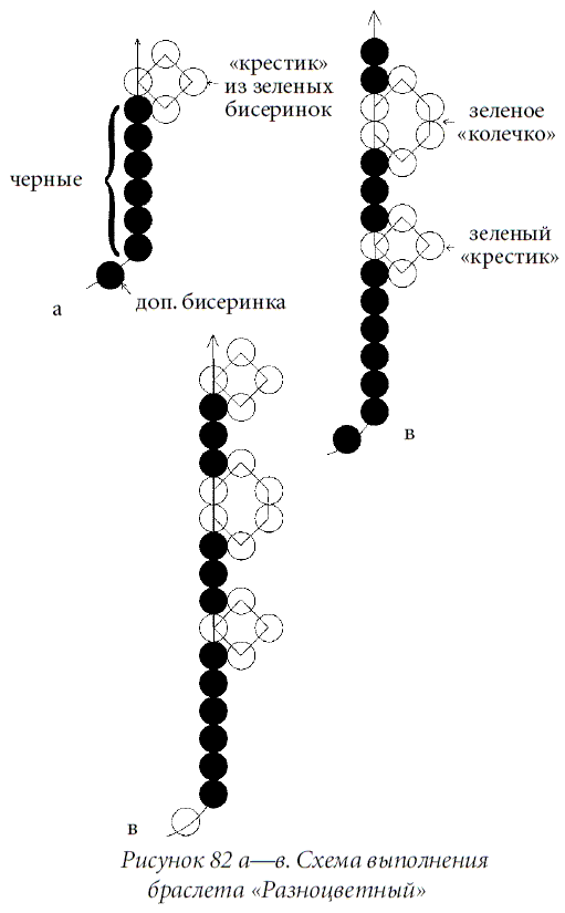 Закрепить нить с помощью дополнительной бисеринки и набрать 3 черных бисеринки, 4 зеленых, выполнить первый "крестик" (рис. 82 а). Набрать 3 черных бисеринки, 6 зеленых и выполнить первое "колечко" (рис. 82 б). Нанизать 3 черных бисеринки, 4 зеленых, выполнить "крестик" (рис. 82 в). Набрать 3 черных бисеринки, 6 красных и выполнить "колечко" (рис. 82 г). Первый "цветок" готов. Нанизать 3 черных бисеринки и 6 желтых, выполнить "колечко" — лепестки второго "цветка" готовы. Далее выполнить еще одно красное "колечко".