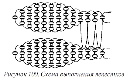 Для лепестка на проволоку длиной 40–42 см набрать 3 бисеринки и плести по схеме, приведенной на рисунке 100. Сплести 3 лепестка из белого бисера и, выполнив основания из зеленого бисера, соединить их между собой. Для маленького листа набрать на проволоку длиной 22–24 см 1 бисеринку, затем 7 рядов по 2 бисеринки и снова 1 бисеринку. Для большого листа на проволоку длиной 48–50 см набрать 1 зеленую бисеринку, следующий ряд — 2 бисеринки, затем 30 рядов по 3 бисеринки, далее 1 ряд из 2 бисеринок и в конце из 1 бисеринки.