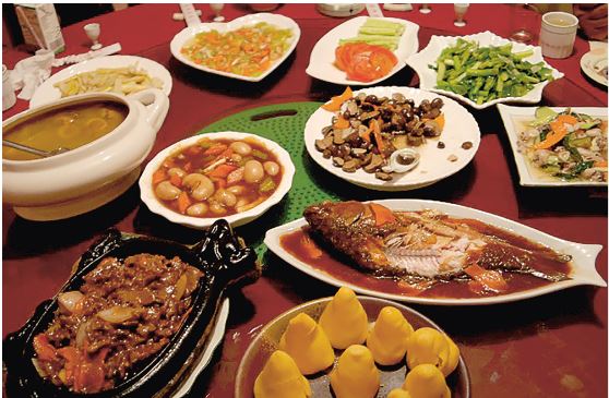 Пища на новогоднем столе – самая разнообразная, и чем обильнее, тем лучше. Но обязательно едят пельмени, вылепленные в форме лунного серпа. Вообще пельмени – единственное блюдо, которое по традиции можно готовить в первые пять дней праздника Весны. В китайском языке слова «готовить» и «ссориться» звучат почти одинаково, а потому хозяйки воздерживаются от готовки – чтобы не ссориться с близкими в наступившем году. Все готовится заранее, и обычно заготовки начинаются в восьмой день двенадцатого лунного месяца, который называется Лаба, по имени каши. Кашу лаба делают как минимум из восьми ингредиентов, включая рис, бобы и разные орехи, что символизирует хороший урожай в будущем году. В этот же день маринуют мясо и чеснок для праздника Весны.