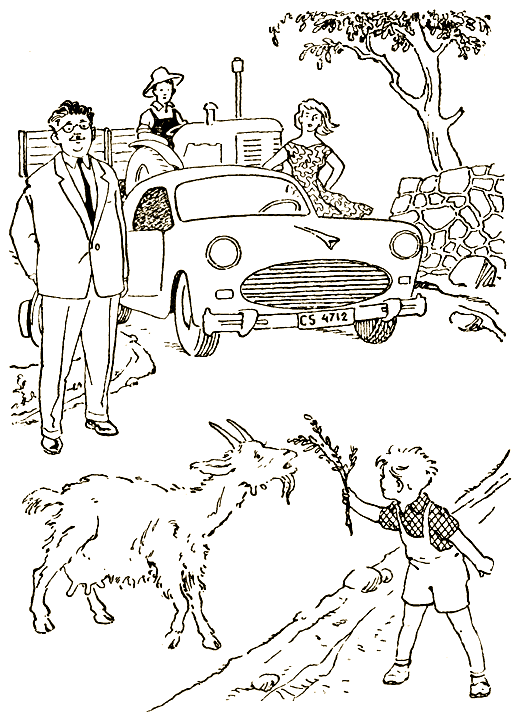Вдруг позади раздался автомобильный гудок. Это означало, что надо дать дорогу. Но коза заупрямилась. Что ей за дело до какой-то машины! Пускай едет по другой дороге, а она, коза, будет стоять здесь и не сдвинется с места.