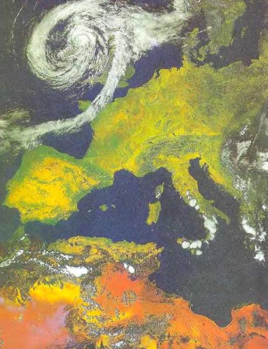 Фотография, сделанная в инфракрасных лучах метеорологическим спутником НОАА-9 6 августа 1986 г. На ней виден ярко выраженный штормовой циклон над Англией.
