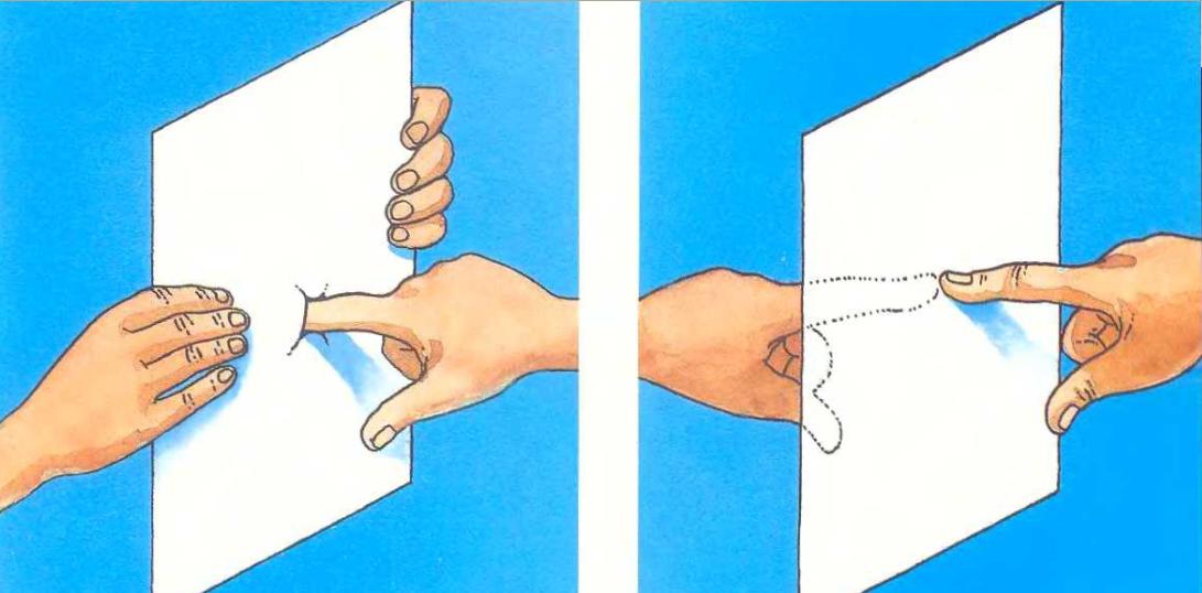 Воздух обладает весом и со всех сторон давит на наше тело. Но он не может раздавить нас, ибо встречное давление тела равно внешнему. Изображенный выше простой опыт делает это очевидным: если с одной стороны надавить пальцем на лист бумаги, он порвется; но если надавить на него с обеих сторон, этого не произойдет.