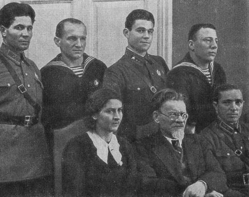 М. И. Калинин в группе награжденных пограничников-хасановцев. Рядом с М. И. Калининым сидят: Герой Советского Союза П. Ф. Терешкин и его жена Е. П. Терешкина, награжденная орденом Красной Звезды. 1938 г.