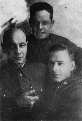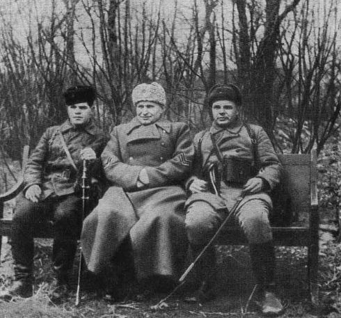 Т. А. Строкач с командиром партизанского отряда Иваном Копенкиным (слева) и комиссаром Михаилом Подкорытовым