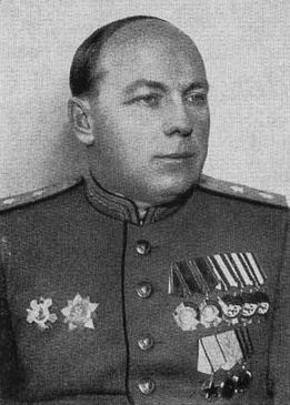 Генерал Т. А. Строкач вручает правительственную награду комиссару ковпаковского отряда генерал-майору С. В. Рудневу, в центре — секретарь ЦК КП(б)У Д. С. Коротченко