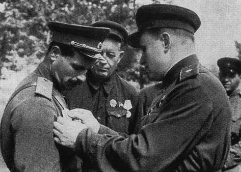 Бригадный комиссар С. И. Гусаров вручает партийные документы отличившимся в боях пограничникам. Карельский перешеек. Осень 1941 г.