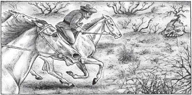 по примятой траве – кавалькада снова поскакала по следам беглецов.Они осторожно пробирались вдоль длинного откоса и, наконец, миновав заросли кустов с сухими рогатыми ветками странной формы, попали в долину. Следы тут становились едва приметными: почва была сухая, бесплодная; только и была здесь опаленная мертвая трава, лежавшая по земле. И все-таки, прижавшись к шеям лошадей, напряженно вглядываясь, то и дело останавливаясь, эти белые всадники не теряли следа беглецов.