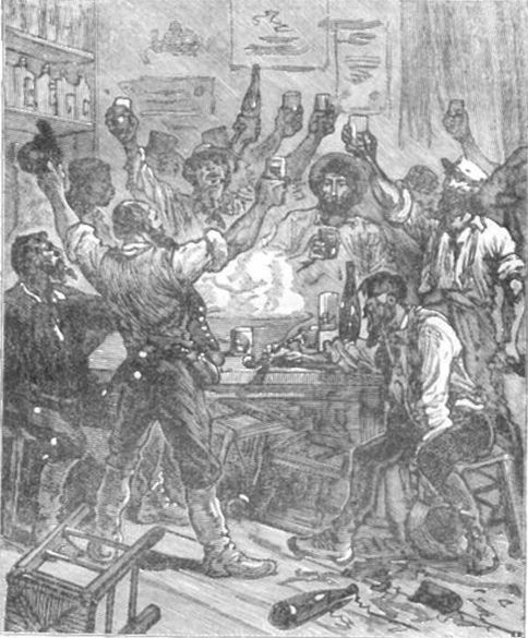 В одно мгновение каждый был на своем посту, готовый лить потоки спиртных напитков в разверзтые глотки гостей. Шум усиливался и перешел в невообразимый гул. Люди вбегали, охваченные волнением, которое объяснять не надо. Тотчас запылал пунш, захлопали пробки, вылетая из бутылок шампанского. Было похоже на салют, сопровождаемый фейерверком.