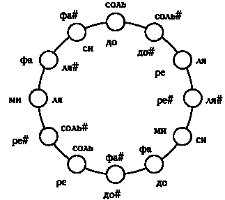 Не будем далеко ходить за примером — на клавиатуре пианино восемь разных ля, и, по сути, мы могли бы сдвигать их на одну октаву выше и ниже до бесконечности, если бы человеческие уши различали неограниченный диапазон частот. Согласно приведенным выше вычислениям, будем называть нотой ля все ноты с частотой 33, 110, 220, 440, 880, 1760 Гц и так далее. Эта ситуация вовсе не нова — вспомните, когда я рассказывал о группе часов, то объяснил, что при взгляде на циферблат мы никак не можем различить шесть утра, шесть вечера, шесть утра следующего дня и шесть вечера предыдущего дня. Одна октава вверх — двенадцать часов вперед. Одна октава вниз — двенадцать часов назад. Нет никакой разницы! Поэтому очень удобно представить клавиатуру пианино в виде так называемого додекафонического круга.