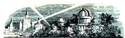 Темный парк. За деревьями виден белый купол обсерватории, Лунный свет проникает через раскрытую крышу обсерватории в круглый зал, ложится на каменный пол. У телескопа работает ученый.